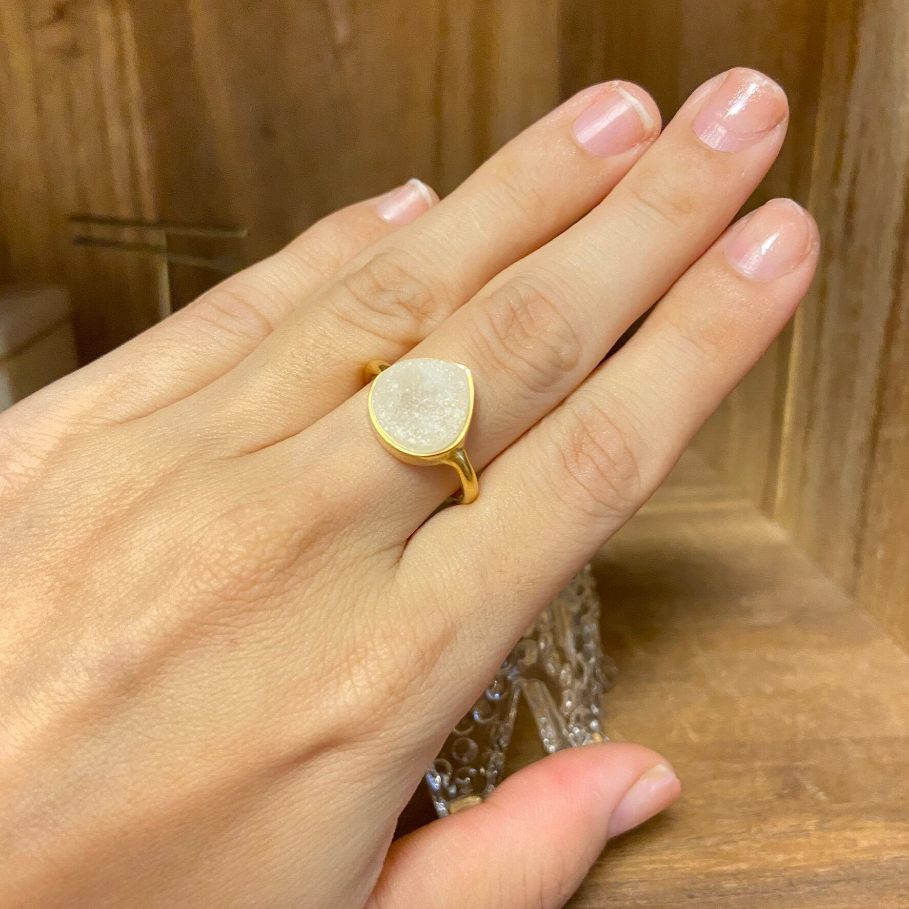 ホワイトのザクザクした結晶瑪瑙をしずく型にカッティングしセンターにセッティングしました