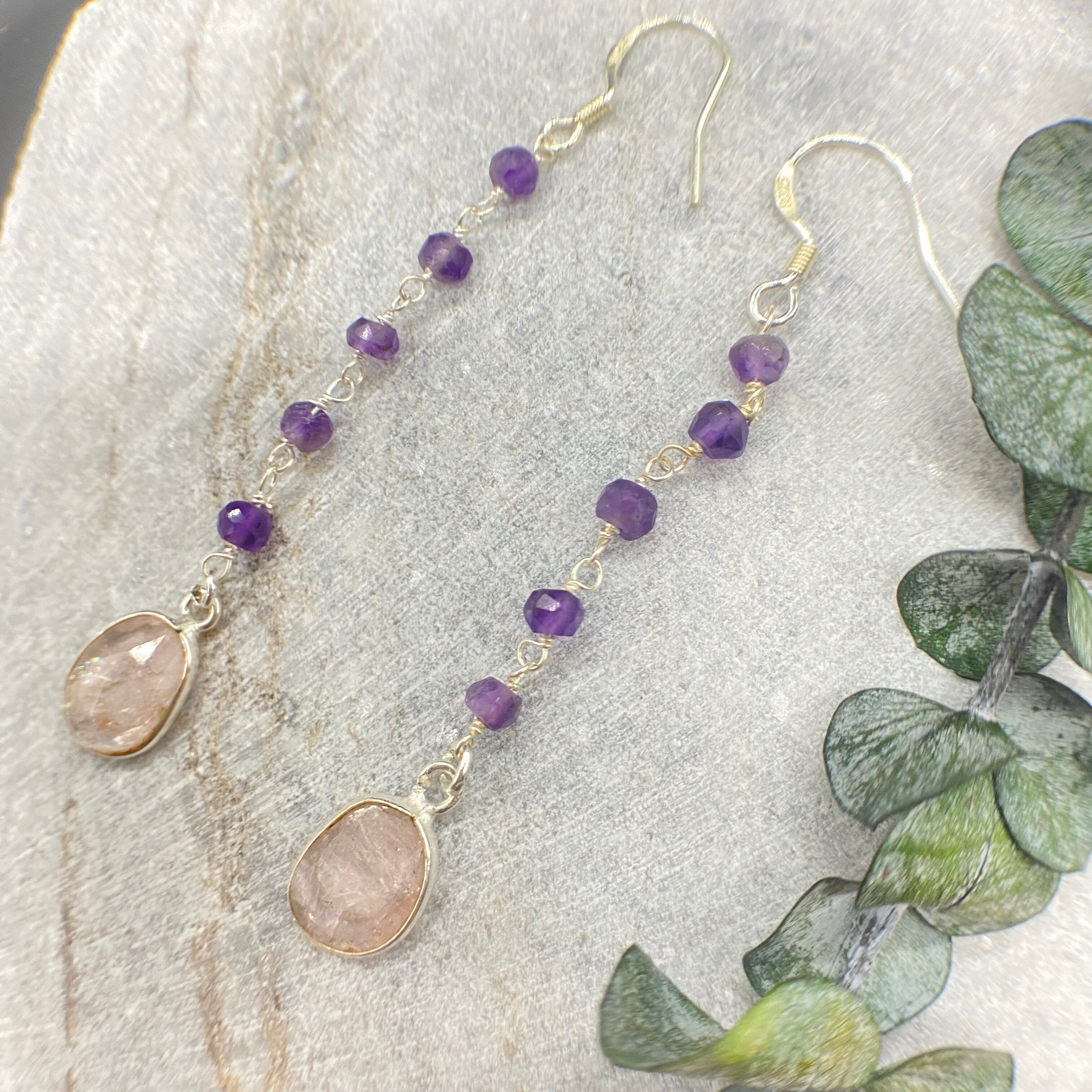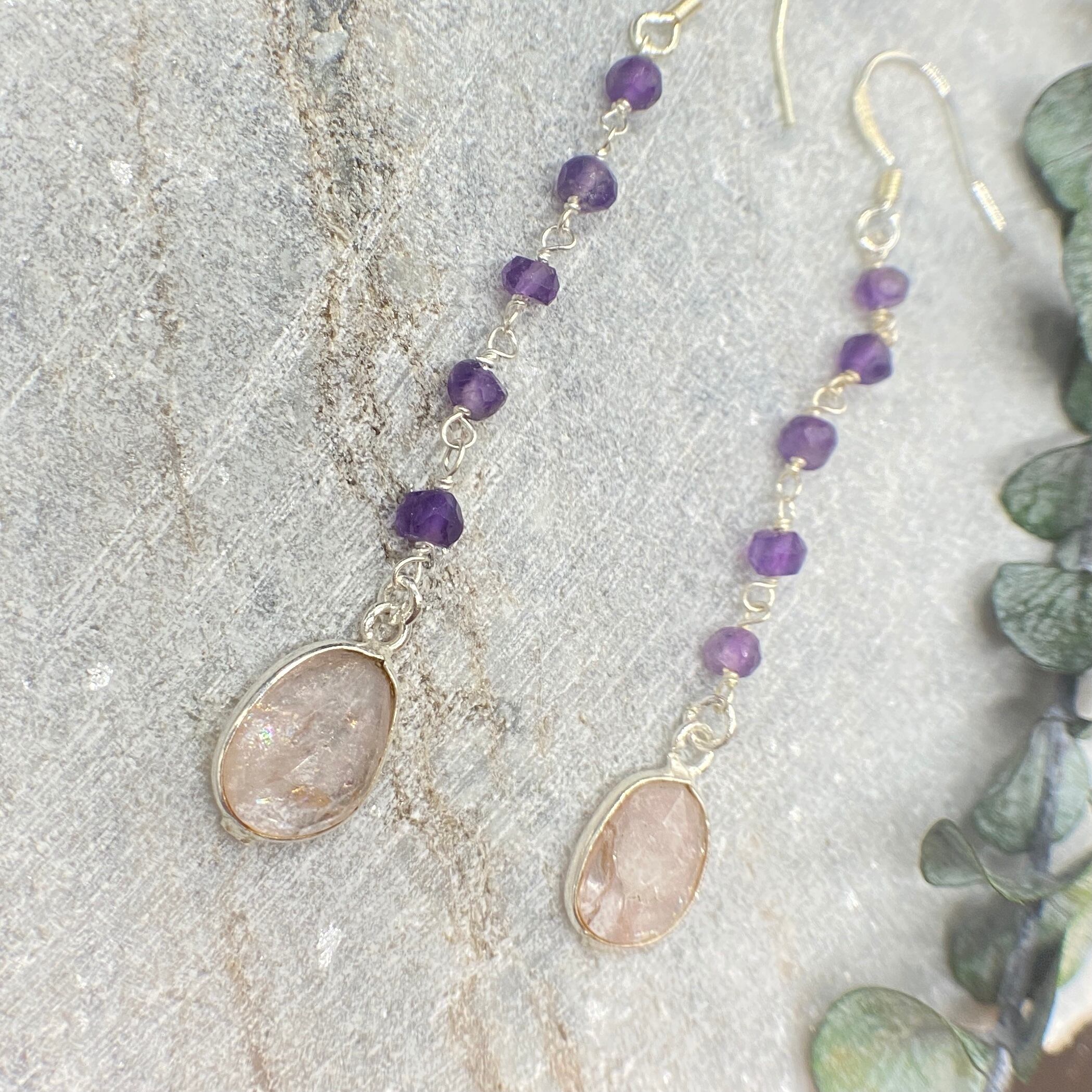 モルガナイトとアメジストチェーンの贅沢な天然石ピアス michiハンドメイド