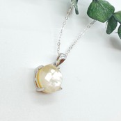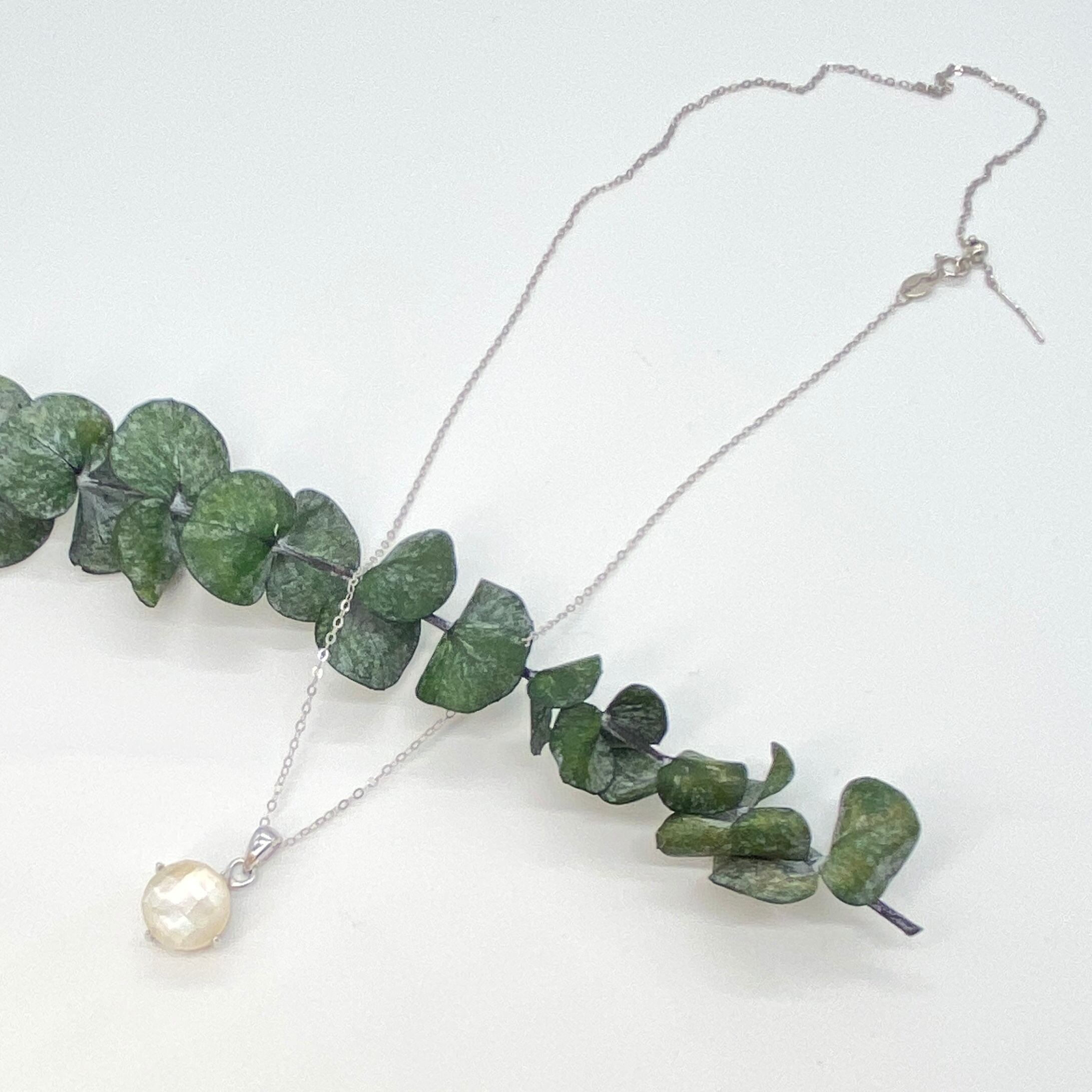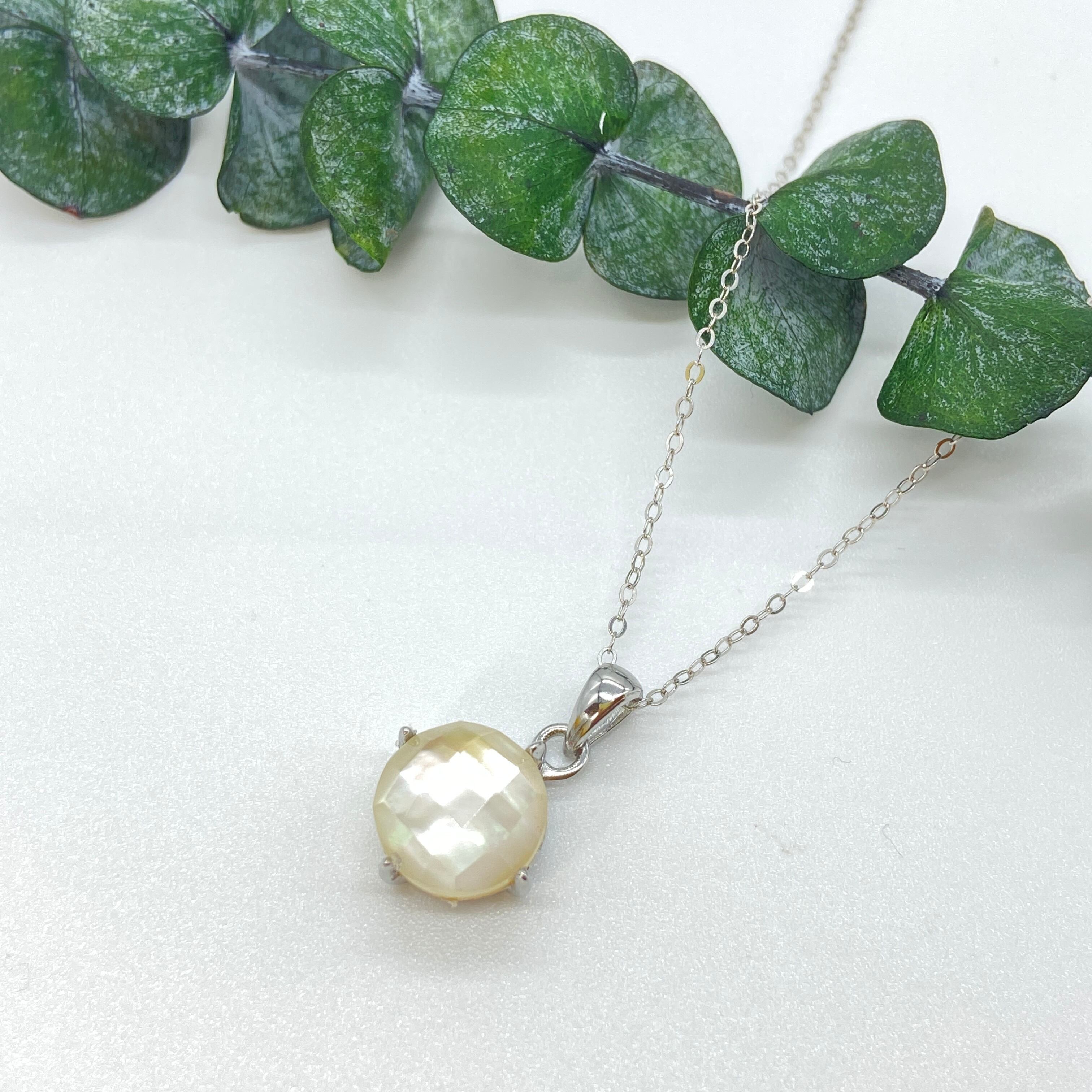美しい白蝶貝をカッティングしその上にクォーツ を重ね合わせたブレッドストーンを作成しネックレスに仕立てました