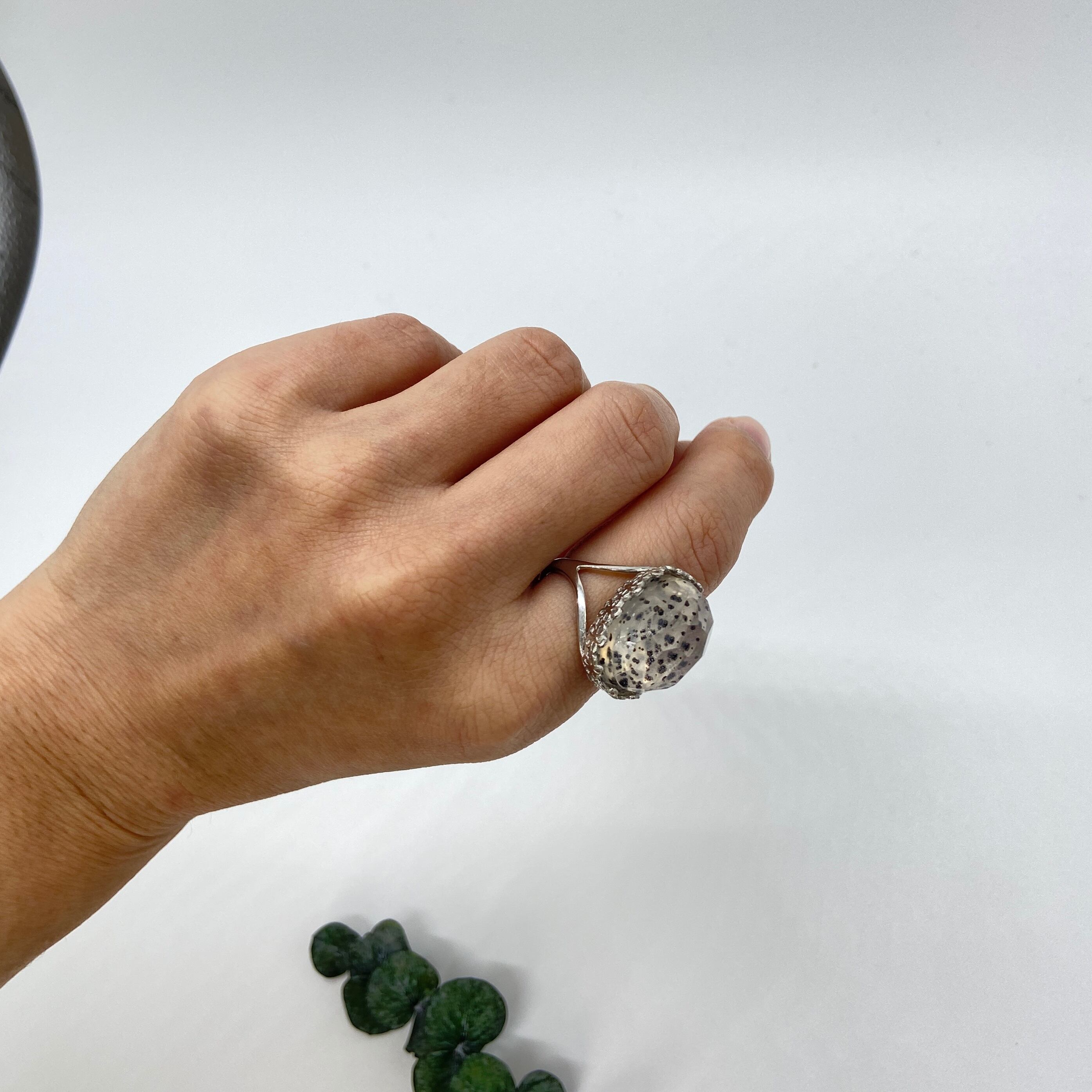 ダルメシアンのようなドットが可愛い デンドリックオパールとクォーツ のダブレットストーン リング(フリーサイズ)