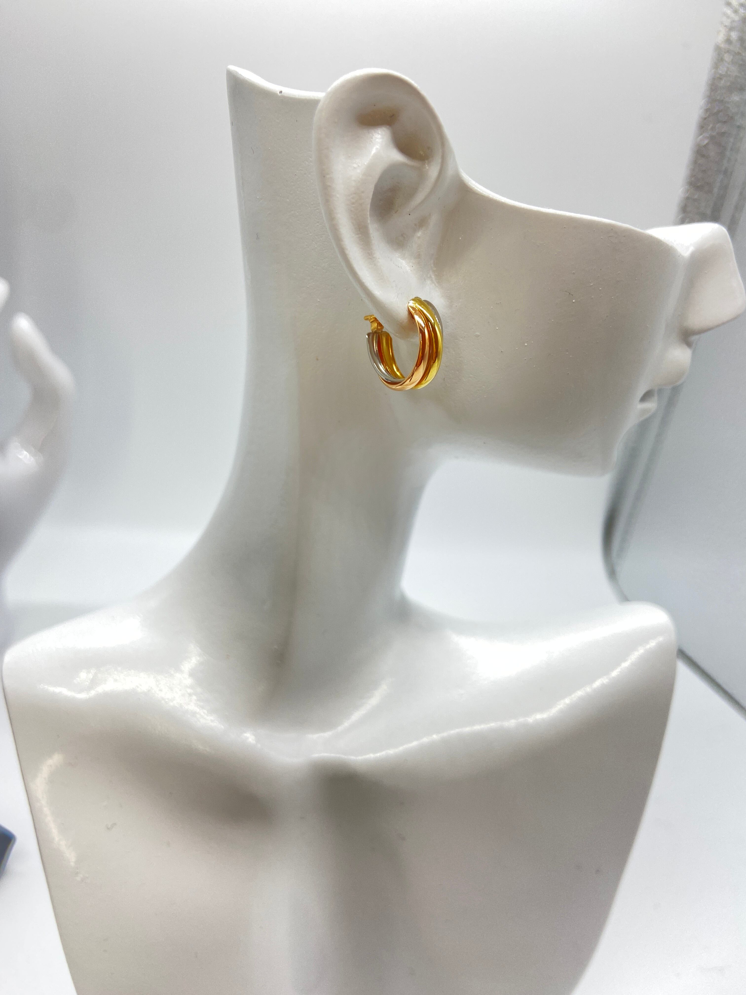 定番の美しさと洗練されたデザイン性を兼ね備えた、スリーカラーゴールドフープピアス